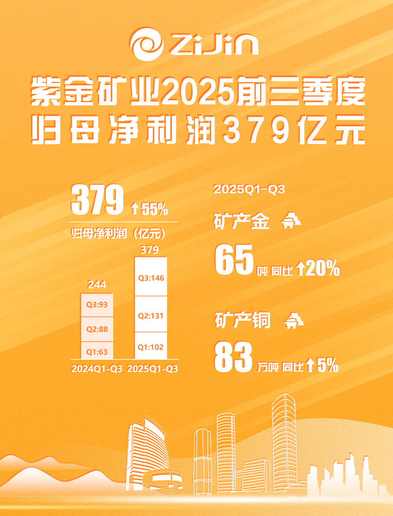 紫金矿业前三季度归母净利379亿元比增55% 矿产金产量65吨比增20%