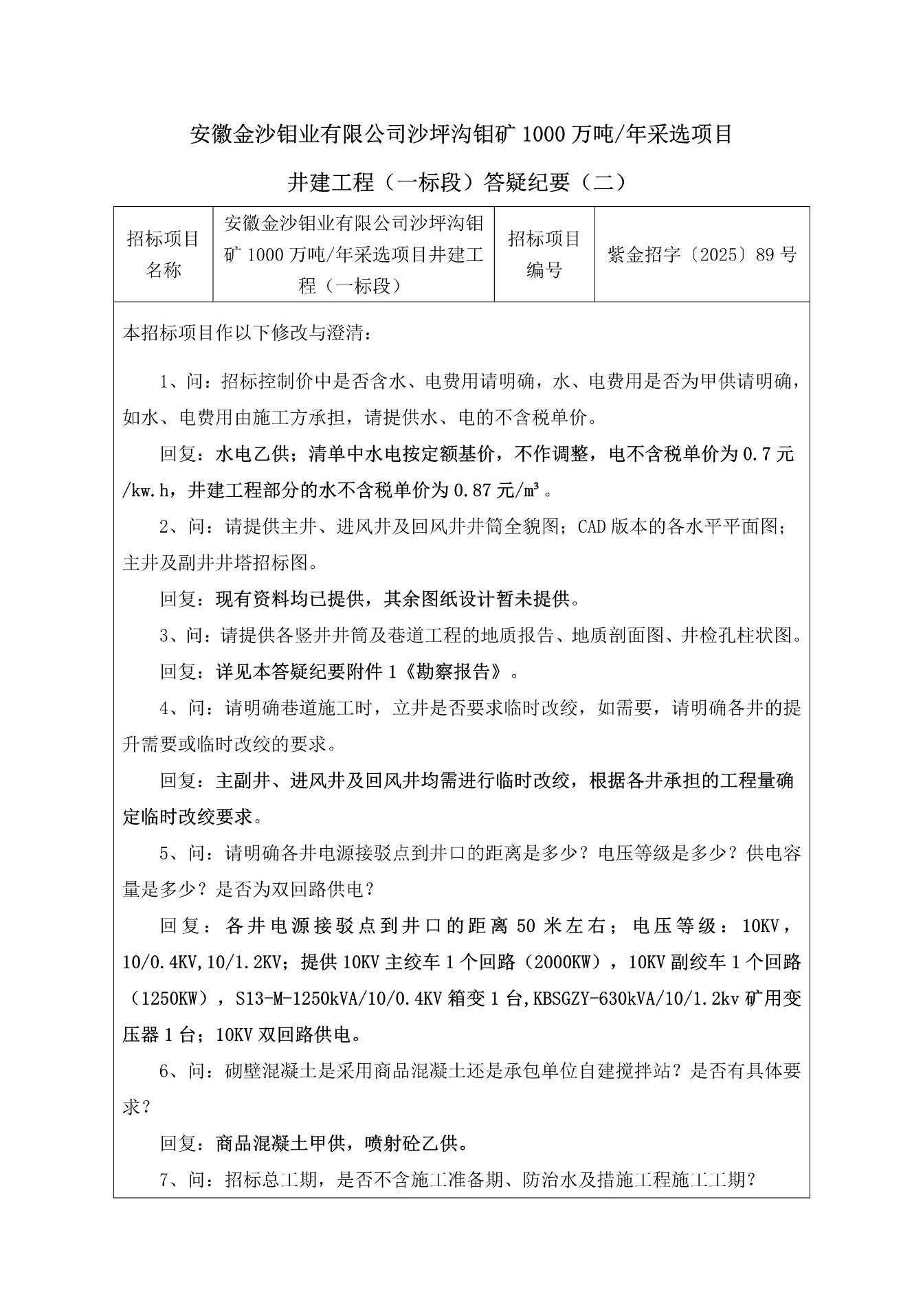 变更公告 | 安徽金沙钼业有限公司沙坪沟钼矿1000万吨年采选项目井建工程(二标段)答疑纪要(二)